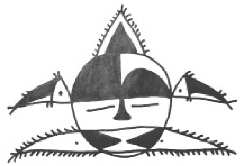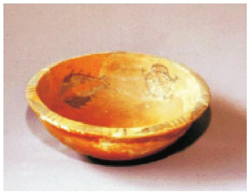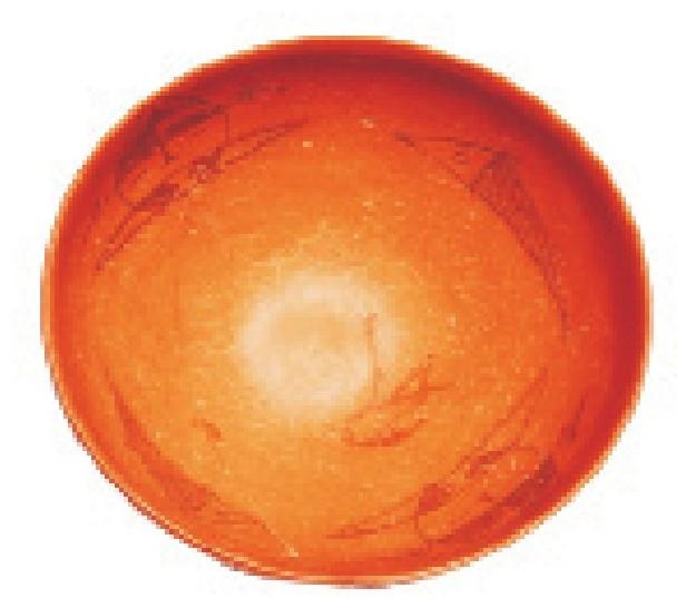 半坡文化。图案花纹简练朴素,绘有人面、鱼、鹿、植物枝叶及几何形纹样。其中最著名的半坡出土单体鱼纹陶盆器纹是用人的脸和鱼的身体结合而成的人面鱼纹,形象概括、简洁,是自然形态的再现。(如图2-1、2-2)