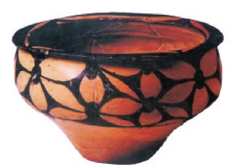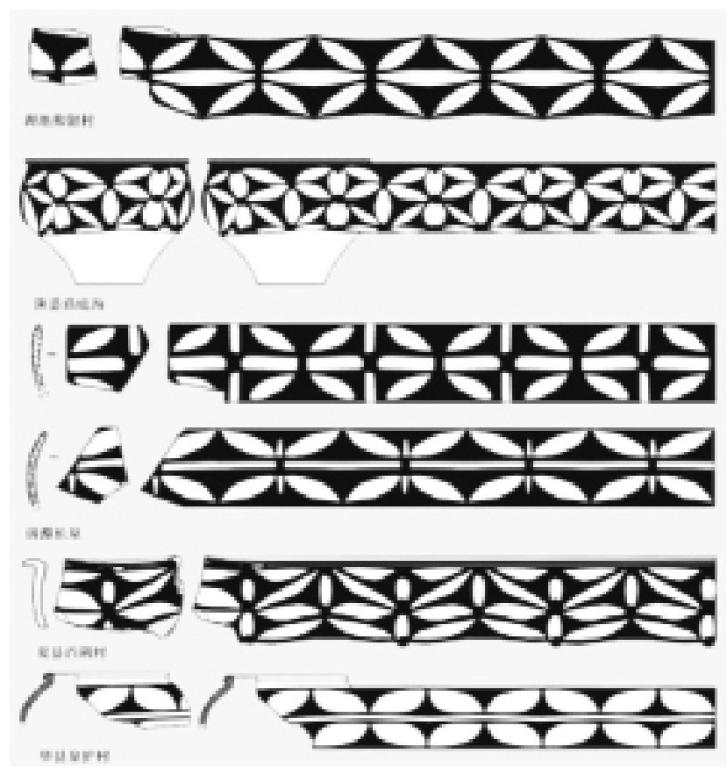庙底沟文化。主要装饰在黑彩陶上,纹饰主要有花瓣纹、钩叶纹、涡纹、三角涡纹、条纹、网纹和圆点纹等,亦有动物纹饰。在做图案装饰时,先是从点入手,然后在点与点之间用曲线或直线连接起来,再与花叶形结合组成优美的二方连续纹样。最为典型的是以弧线组成的月形、花瓣形与圆点相结合的形状,反复连续构成清新、活泼的图案。纹样的黑白各自成形,并有阴阳双关、虚实相生的意味,较之半坡类型彩陶,更富有一种诱人的律动感。(如图2-5、2-6)