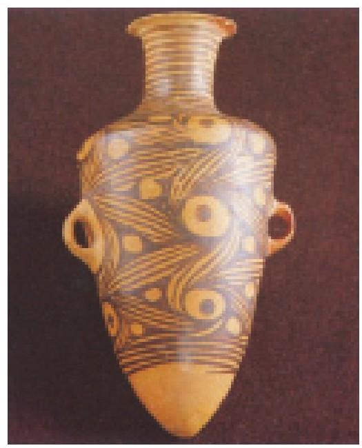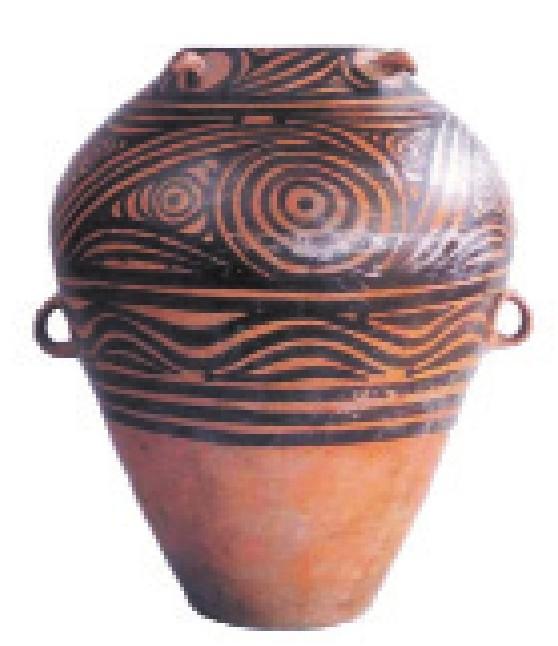 马家窑文化。纹样主要以旋涡纹为主。其典型为彩陶瓮,瓮高46厘米,口沿有四只提耳,平口、短颈、阔肩,腹部逐渐下收,平底,系泥制红陶。陶器外壁用黑彩绘出上、中、下三层纹饰。上层为花卉纹,中层为旋涡纹,下层为水波纹。(如图2-7、2-8、2-9)