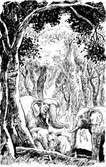 我晕头转向,像俘虏似的被它们押着走了大半个小时,来到一棵独木成林的老榕树下。象鼻猛地一推,我跌倒在地。嘿,在我面前两尺远的树根下,躺着一头小象。