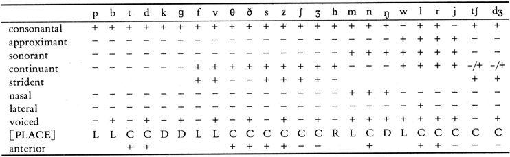 (Source: Radford, et al. 1999: 141. Note that 1) L = Labial, C = Coronal, D = Dorsal, R = Radical. 2) "-/+" is a special type of feature value for an affricate indicating that the sound has both specifications, one after another. 3) "anterior" is used to separate "coronal" into two further regions.)