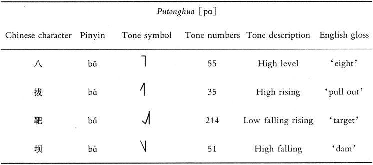 In Chinese tone changes are used in a different way, affecting the meanings of individual words. In Chinese Putonghua, a syllable such as [pɑ] can have at least four meanings depending on the tone on which it is spoken (Table 2.7). More meanings are found if we consider the different characters with the same pronunciation and tone form. Languages like Chinese are known as TONE LANGUAGES.