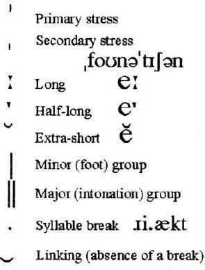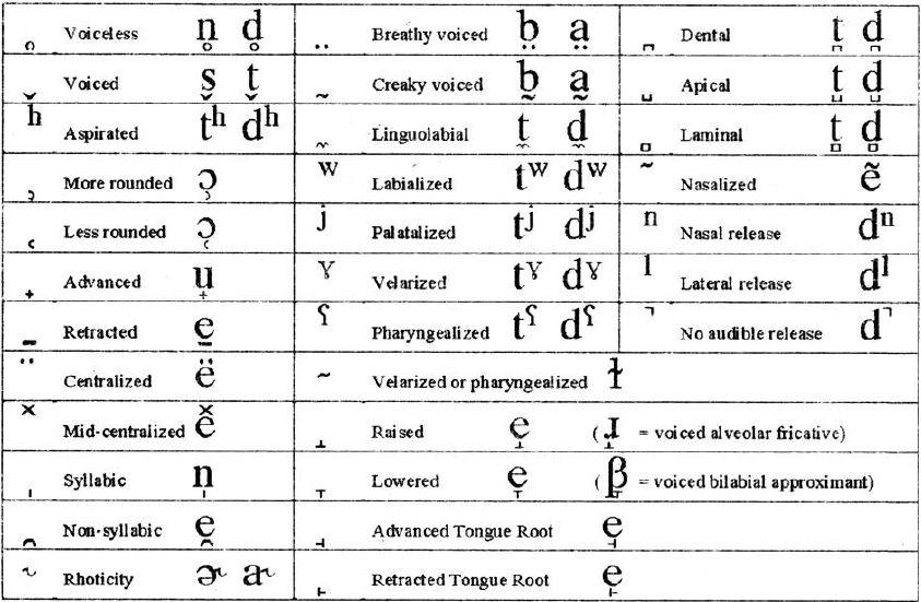 The DIACRITICS are additional symbols or marks used together with the consonant and vowel symbols to indicate nuances of change in their pronunciation. The suprasegmentals are used to represent stress and syllables, whereas the last group of symbols is used to show tonal differences and intonation patterns.