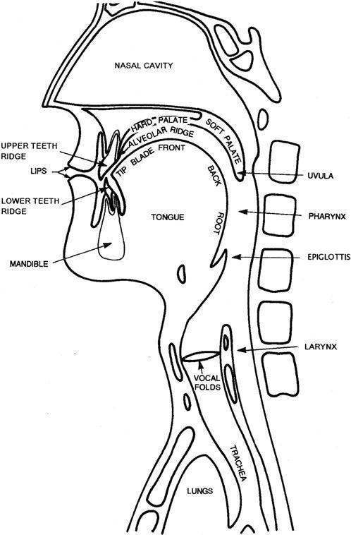 SPEECH ORGANS, also known as VOCAL ORGANS, are those parts of the human body involved in the production of speech (Figure 2.2). It is striking to see how much of the human body is involved in the production of speech: the lungs, the trachea (or windpipe), the throat, the nose, and the mouth.