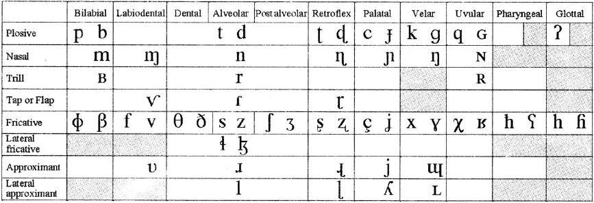 Where symbols appear in pairs, the one to the right represents a voiced consonant. Shaded areas denote articulations judged impossible.