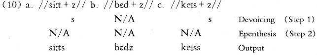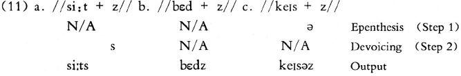 In Step 1 devoicing is applied, giving [s] for [siːts] for seats and [keɪss] for cases because they both end in voiceless consonants. When we come to Step 2 there is nowhere to add [ə] as neither (a) nor (c) contains a [z]-ending [z] has been changed to [s] for cases. The epenthesis rule cannot apply to [s]! Clearly, something has gone wrong. The problem is that devoicing will always apply to /z/ after a voiceless consonant and then there is never the environment for epenthesis to apply. The obvious solution is to say that epenthesis will always apply before devoicing, as in (11):