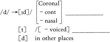 The features [C, -cont, -nasal] are sufficient to separate [t] and [d] from all other consonants. We take /d/ as the underlying (phonemic) form because it is the mostly distributed covering all sonorants. [ɪd] is the most specific and therefore must be applied first among the three possibilities, according to the Elsewhere Condition 【1】 .