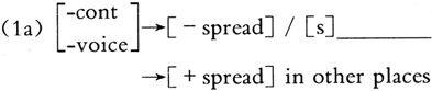 A useful feature for consonants not found in Table 2.6 is [±spread] (for "spread glottis"), which distinguishes between "aspirated" and "unaspirated" voiceless obstruents. Aspirated sounds are [+ spread] and unaspirated sounds are [- spread]. Now we can represent the rule that governs the unaspiration of /p/ after [s] in 2.3.3 (1) in terms of features, as in (1a):