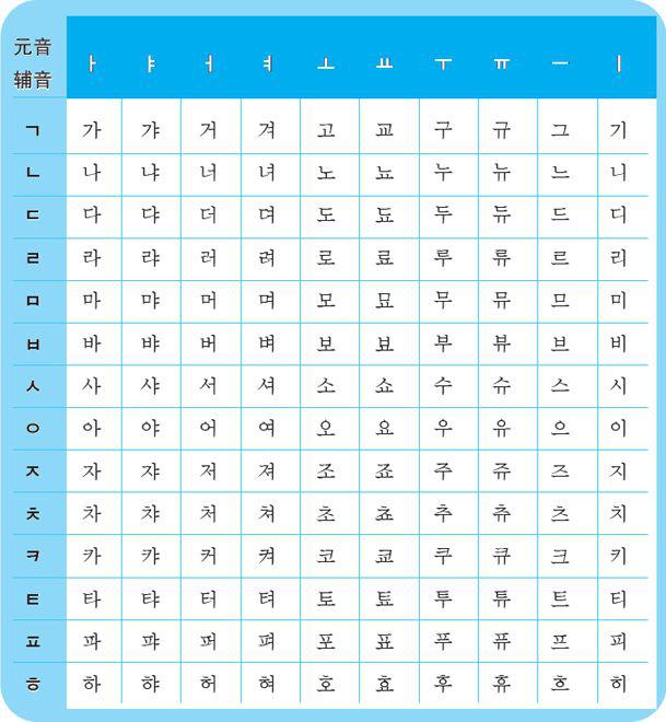 모음(元音):ㅏ ㅑ ㅓ ㅕ ㅗ ㅛ ㅜ ㅠ ㅡ ㅣ