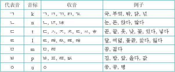 在韩国语中,收音共有27个,其中单收音16个,双收音11个,但是实际发音只有“ㄱ”、“ㄴ”、“ㄷ”、“ㄹ”、“ㅁ”、“ㅂ”、“ㅇ”7个音,具体归纳如下:
