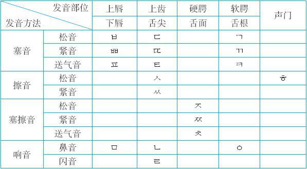 辅音:ㄱ,ㄲ,ㄴ,ㄷ,ㄸ,ㄹ,ㅁ,ㅂ,ㅃ,ㅅ,ㅆ,ㅇ,ㅈ,ㅉ,ㅊ,ㅋ,ㅌ,ㅍ,ㅎ