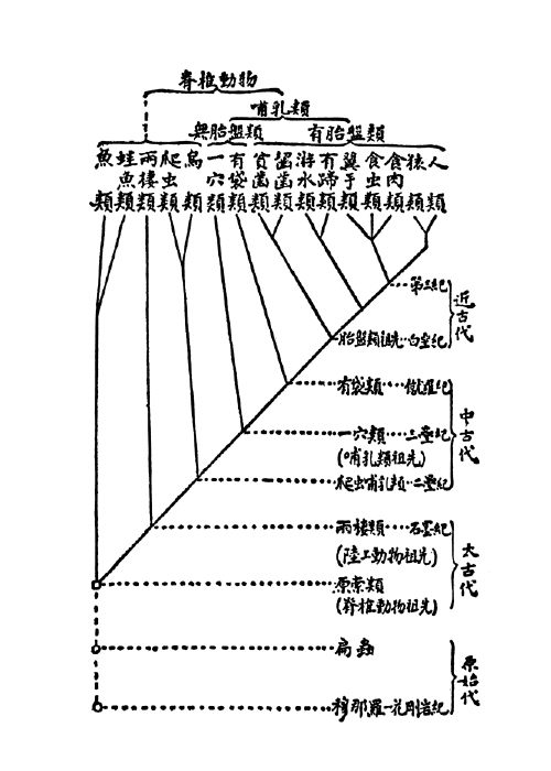 往之言此事者,有达尔文《原人论》,赫胥黎《化中人位论》。黑格尔著《人类发生学》,则以古生物学个体发生学及形态学证人类之系统,知动物进化,与人类胎儿之发达同,凡脊椎动物之始为鱼类,见地质学上太古代之僦罗纪,继为迭逢纪之蛙鱼,为石墨纪之两栖,为二叠纪之爬虫,及中古代之哺乳动物,递近古代第三纪,乃见半猿,次生真猿,猿有狭鼻族,由其族生犬猿,次生人猿,人猿生猿人,不能言语,降而能语,是谓之人,此皆比较解剖个体发生及脊椎动物所明证者也。惟个体发达之序亦然,故曰种族发生,为个体发生之反复。然此仅有脊椎动物而已,若更上溯无脊椎动物而探其统系,为业尤艰巨于前。盖此种动物,无骨胳之存,故不见于化石,特据生物学原则,知人类所始为原生动物,与胎孕时之根干细胞相当,下此亦各有相当之动物。于是黑格尔乃追进化之迹而识别之,间有不足,则补以化石与悬拟之生物,而自单幺以至人类之系图遂成,图中所载,即自穆那罗(Monera)渐进以至人类之历史,生物学上所谓种族的发生者是也。其系图如别幅。(见下页图)