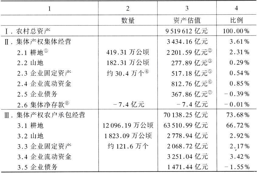 这个新形成的产权结构,包含着一些极为重要的特点。首先,由农户和个人长期承包经营的社区集体资产,占据全部农村资产的70%以上,构成目前中国农村生产活动最主要的制度形式。