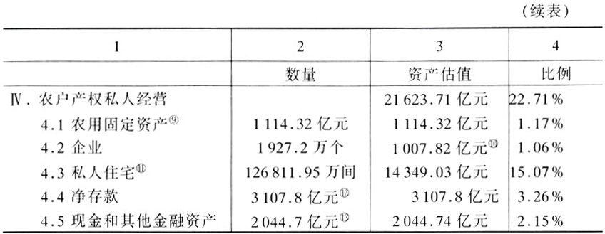 再次,农户家庭及其自由联合的私产已占全部农村资产的23%。农民私产的绝大部分为私人住宅(占全部私产的66.4%),可用于生产投资的资产规模尚很小。但在整个农村产权结构中,农民私产成长最为迅速。