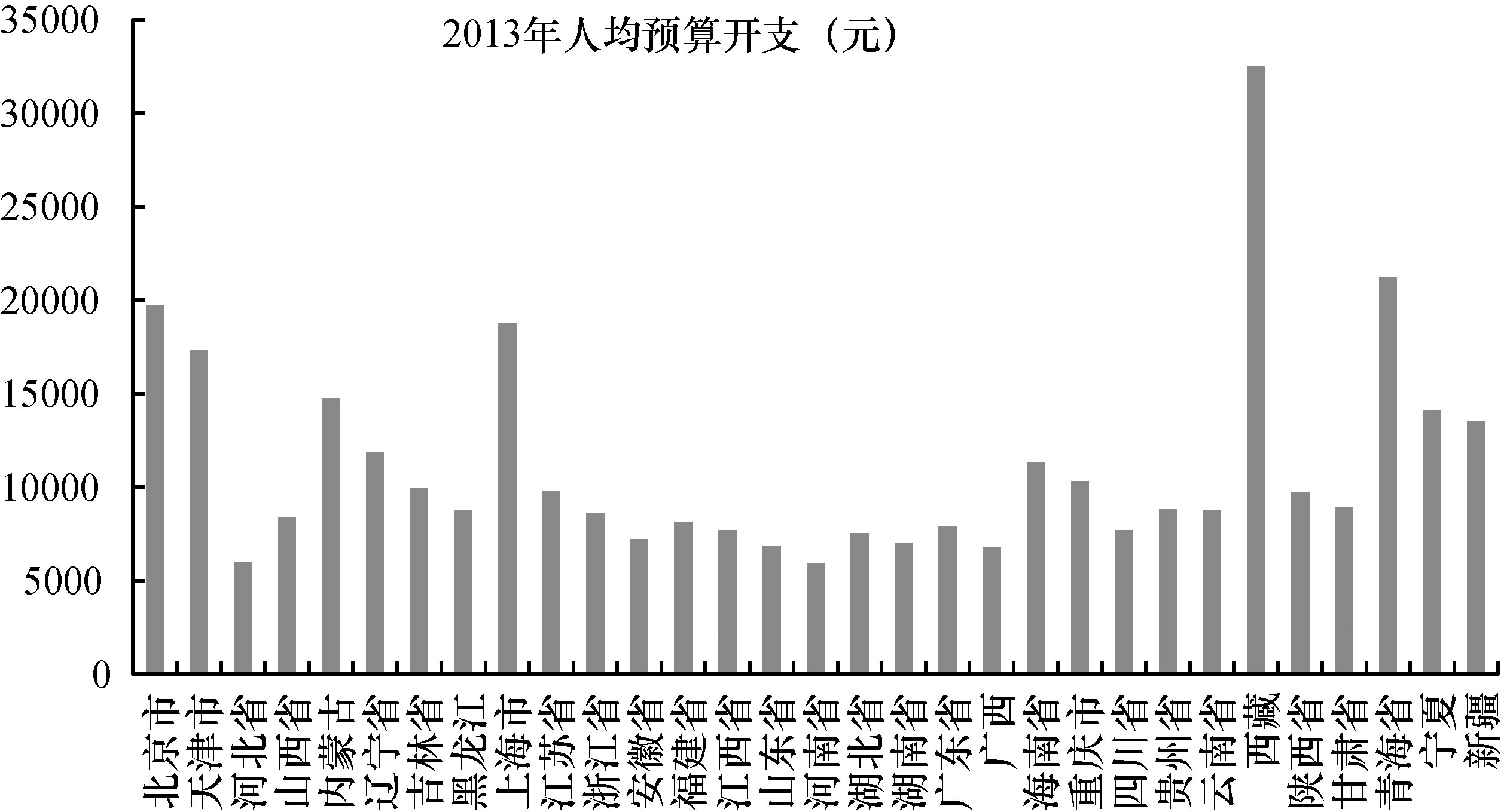 和人均收入类似,中国地方政府的人均开支也呈现出很大的地区差别,上海、北京、天津等大城市的人均开支远超过贵州、安徽、四川、广西等不发达地区(西藏得到大量中央转移支付,因而只能算特例)。和人均收入相比,人均开支带有更明显的公权力性质。如果人均开支可以衡量地方财政为当地公民提供的公共服务,那么人均开支差异表明公民从一个地方迁移到另一个地方所享受的公共服务存在显著差别,城市居民所享受的公共服务远比农民更多。按理说,单一制国家应在地方均衡上发挥更大的作用,中国的中央政府在这方面发挥的作用尚不理想。