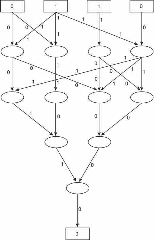 在思考这个问题之前,我们必须找到一种方法来数学化地表示计算机,并且要尽可能简单。图4所显示的就是一种极好的方法。它包含许多层节点,连结点和点之间的线段称作“边”。进入到最顶层的称作“输入”,这是一条0和1的序列,从最底层出来的叫作“输出”,是另一条0和1的序列。节点分为三种,分别称作“与门”、“或门”和“非门”。每一个门都从连结上层的边中接收到一些0和1。它再根据所接收到的数码来自己发出一些0和1,所遵循的简单规则如下:与门当接收到的输入全部为1时,输出1,否则输出0;或门当接收到的输入全部为0时,输出0,否则输出1;非门只允许一条边连结上层,它在接收到1时输出0,接收到0时输出1。
