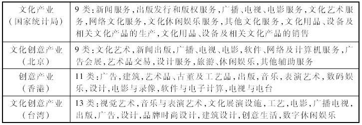 表2-1 国家统计局、北京、香港和台湾对文化产业的分类