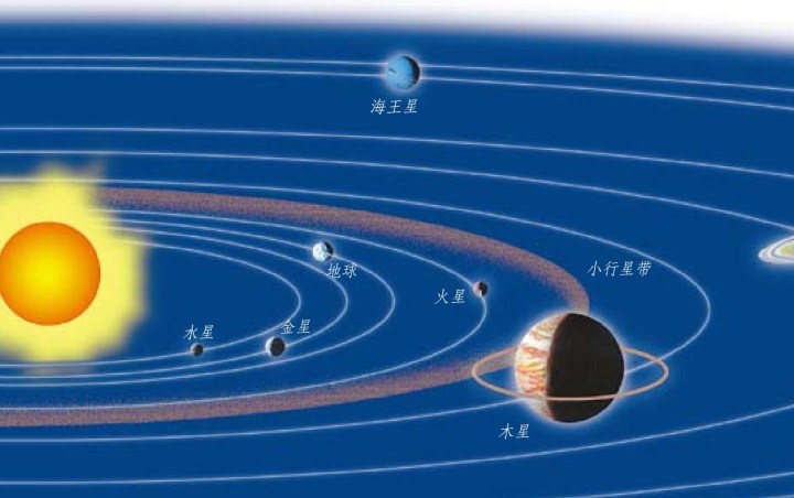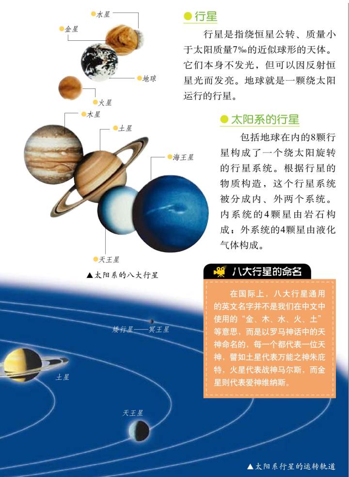 几十万年前,以太阳为中心,若干大行星、小行星、卫星、彗星、流星和行星际物质在太阳周围陆续诞生,构成了行星系统,围绕太阳运转,这就是我们的太阳系。太阳是太阳系的主体,质量占整个太阳系的99%以上。在太阳系内,现在已经观测到了8颗大行星,分别是水星、金星、地球、火星、木星、土星、天王星和海王星。除了水星和金星外,每颗大行星都有自己的卫星,卫星围绕着行星运动。