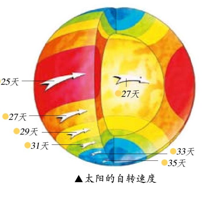 作为一颗恒星,太阳并不是固定不动的。在带动整个太阳系在银河系中公转的同时,太阳自身也在不断地进行自转。太阳在赤道处自转一周大约相当于地球上的25天,在极地附近自转一圈需要约35天,而中心部分的自转速度大约是27天一圈。