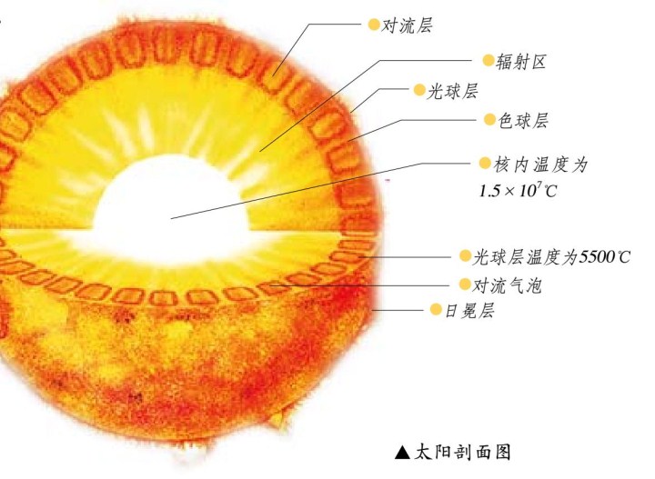 太阳是一个燃烧着的大气球体,它从里向外分为3个层次,分别是产能核心区、辐射区和对流区。其中产能核心区就是太阳发生核聚变反应的地方,这里产生的能量通过辐射、对流等形式传到太阳表层,最后辐射到四方,我们才可以感受到太阳的光和热。太阳的表面是厚达500千米的热气流,即光球层。光球层向外,依次还有色球层和日冕,这两层中气体逐渐变得透明,光线也逐渐射向宇宙空间。