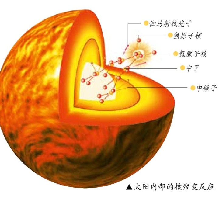 太阳的中心时时刻刻都在发生一种4个氢原子聚变成1个氦原子的核聚变反应,每一次核聚变都相当于爆炸一个氢弹,会释放出大量的辐射能,变成光和热。