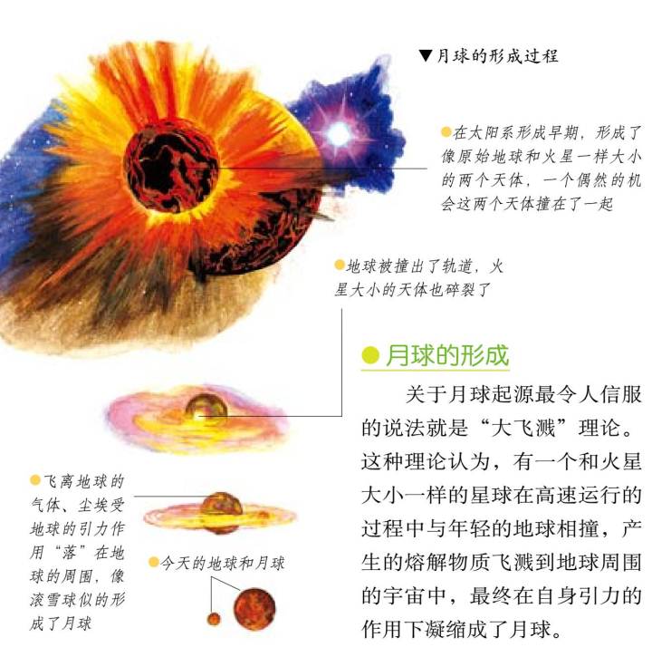 月球是地球的天然卫星,我们把它叫做“月亮”。它本身不会发光,因为反射了太阳光,才有了美丽的月光。由于距离远近的关系,月亮看上去和太阳差不多大,其实它比太阳小得多,比地球也小得多。古时候,人们不了解它的真面目,曾经想象出了许多美丽的传说,实际上,它上面没有大气,没有液态水,引力也很小,荒凉的表面上有山脉,有深谷,最多的则是环形山。但月球却对地球有着许多重要的影响,例如产生潮汐、日食现象等。