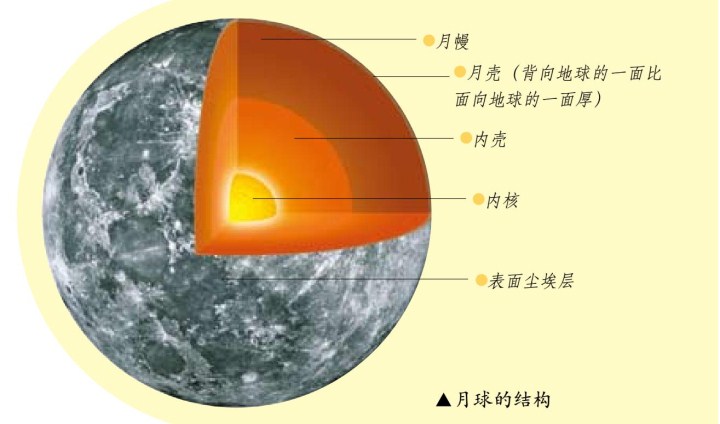 科学家发现,月球有一个含铁和硫的小核,这个小核被一层半熔化状的岩石层所包围着,这层外面是一层固态岩石,称为岩石圈,最外层则是一层岩石壳。