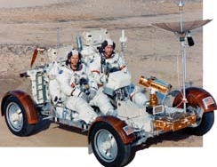 月球车是可以在月球表面行驶的电动车,它是宇航员在月球上活动必不可少的助手。它按照乘坐的两名宇航员的身体条件设计而成,由电能驱动,最高的行驶速度为每小时13千米。阿波罗15号、16号、17号的登月宇航员正是由于配备了月球车,才可以在月球上行走。