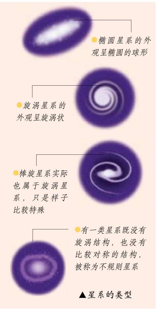 星系实际是由大量恒星围绕着一个共同中心构成的一种大型宇宙天体系统。星系包括数不清的恒星,还包括许多星团、星际物质和星云。它们就像是恒星聚居的“城市”,这些“城市”通常非常巨大,星光从星系一端传到另一端要用几千万年的时间。我们熟悉的太阳就是银河系几百亿颗恒星中的一颗。