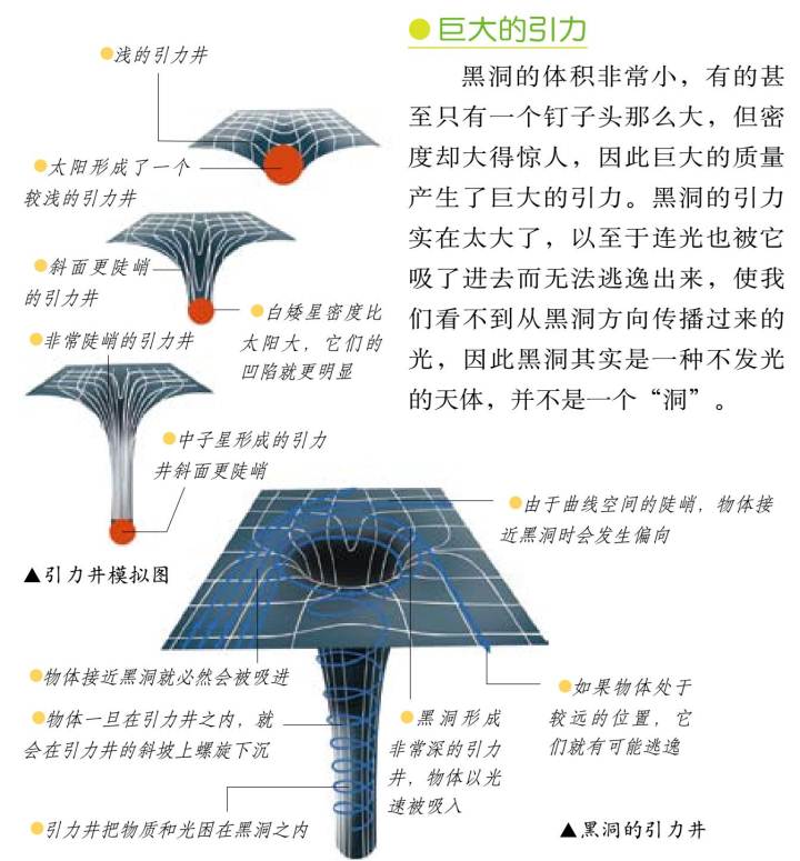 1915年,爱因斯坦发表了惊人的广义相对论。他认为,万有引力是宇宙的一种特性。物体能使周围的空间弯曲:空间像一个橡胶平面,把一个球放上去,平面就会出现一个“井”。黑洞就是这样造成的一个无底深渊般的“井”,强大的吸引力会把周围的物体吸进去,并且永远不会再放出来。