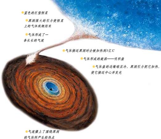 如果黑洞在一颗恒星附近形成,它强大的引力就会把那个星球的气体吸过来。气体向黑洞倾斜,在它周围形成一个巨大的旋涡。漩涡旋转使这些气体变热,并发出强光及大量的X射线。同时,靠近黑洞的恒星则会变轻,直到被黑洞“吃掉”。2004年,科学家就在代号为“RX-J124211”的星系中观测到了一个被黑洞撕裂的恒星。这颗“倒霉”的恒星偏离轨道靠近了黑洞,它的质量和太阳相当,而那个黑洞的质量则是太阳的1亿倍。
