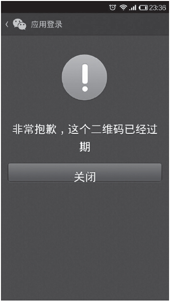 左边是一个二维码,用微信“扫一扫”功能扫描后会自动登录。如果页面放置一段时间后再去登录,微信扫一扫后出现错误页面(见图3-30)。