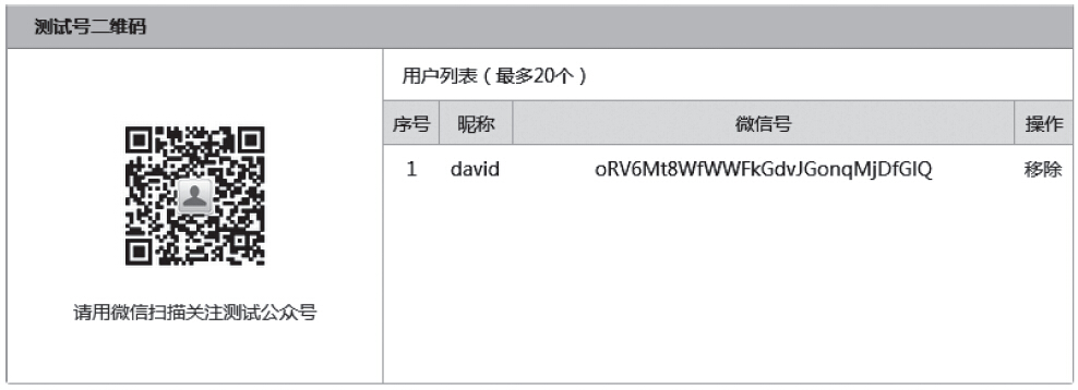 扫描测试公众号的二维码,并关注,就能在管理测试页看到用户列表(见图3-33)。