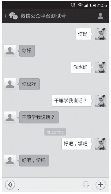 PHP SDK默认的用户消息处理方法是返回用户发送的信息,即“鹦鹉学舌”,效果如图3-34所示。