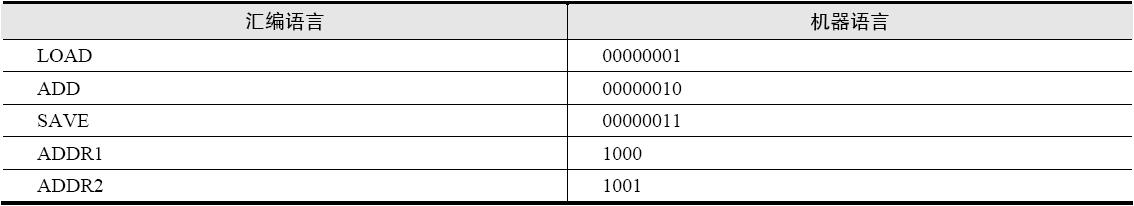 00000001 00000001 (将1 载入累加器) 00000011 1000 (把1 暂存到内存中地址为1000 的单元) 00000001 00000010 (将2 载入累加器) 00000010 1000 (将内存地址为1000 的单元中的数据和累加器中的数据相加) 00000011 1001 (将运算结果输出到内存中地址为1001 的单元中)