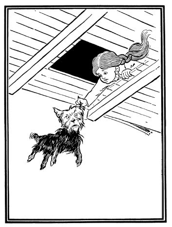 多萝西爬到洞口,抓住了吐吐的耳朵,把它拽到屋子里。