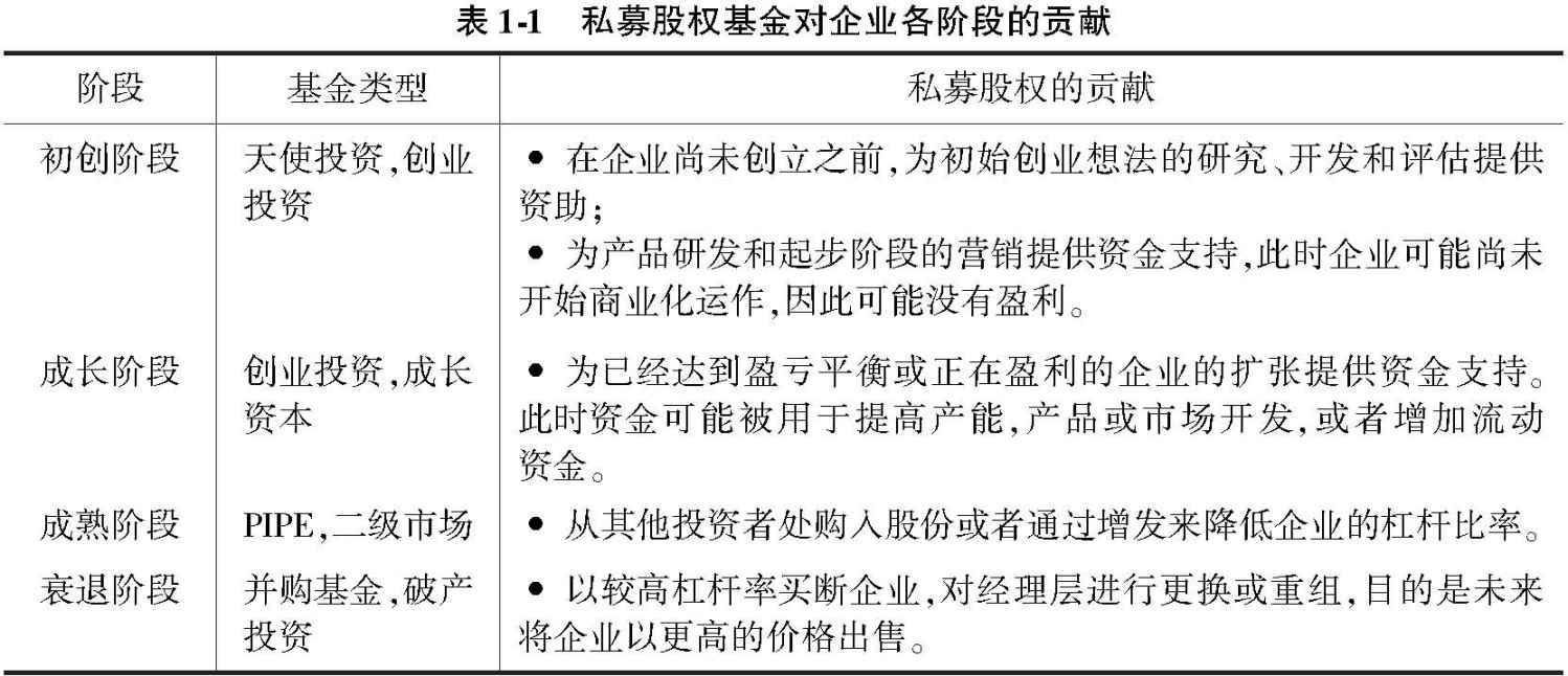 我们通常把一个行业发展的阶段分为初创、成长、成熟和衰退四大阶段。由于各个阶段企业的风险收益特征有显著不同,私募股权投资的方式和理念也差别很大(见表1-1)。