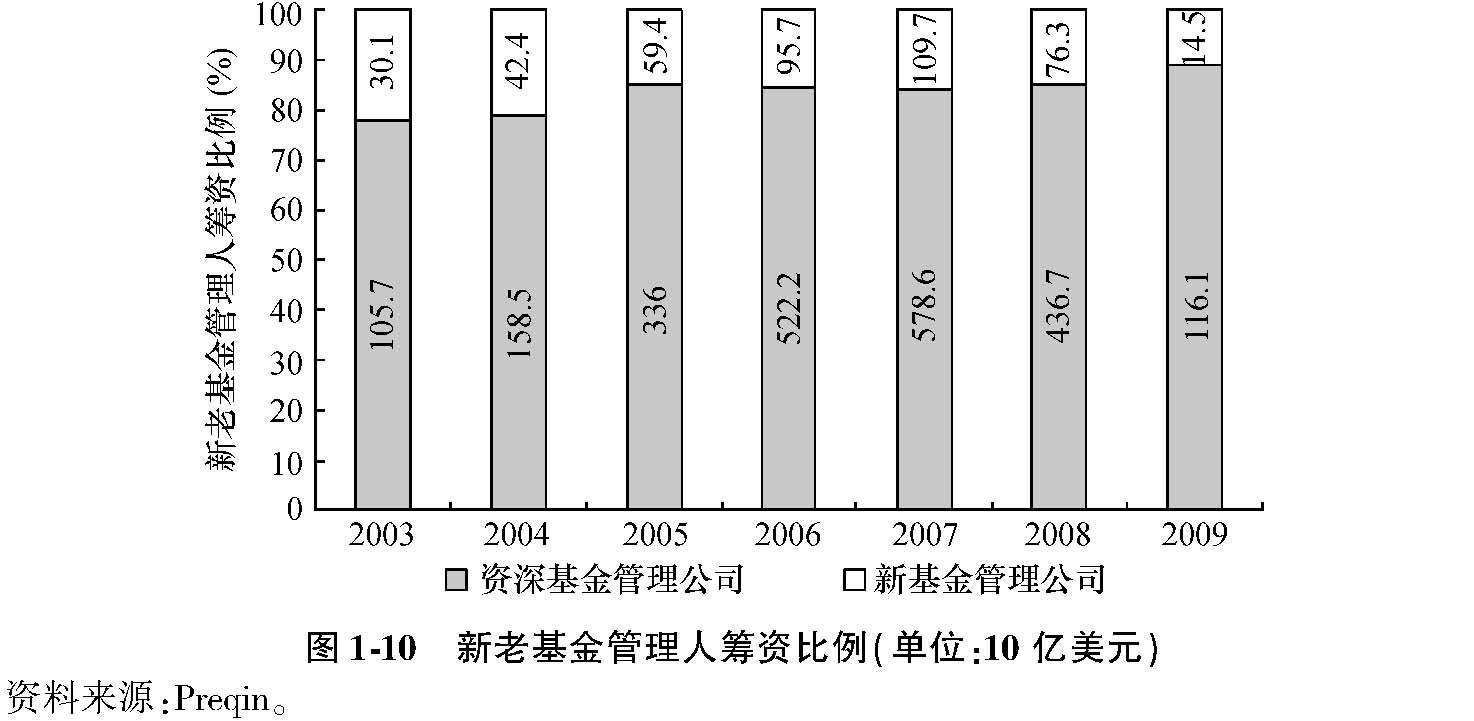 有经验的投资者会尽力维持与优秀基金管理人的长期关系。因此后续基金的主要投资者通常是“回头客”。新基金管理人要获得投资者的认可则比较难,通常筹集基金所需要的时间也较长。根据Preqin 2011年的问卷调查,约40%的机构投资者直言不投资新基金管理人。这虽然是后危机时代的保守态度,但也反映了行业的潜规则。资深管理人的声誉和关系网优势在投资中也有体现。企业更愿意与有着良好履历的基金管理人进行合作。此外,资深基金管理人借助其资金优势,往往可以完成小基金管理人所不能企及的大型交易,其利润也较为丰厚。两方面的因素相结合,私募股权基金管理业的两极分化格局自然而然便形成了(见图1-10)。
