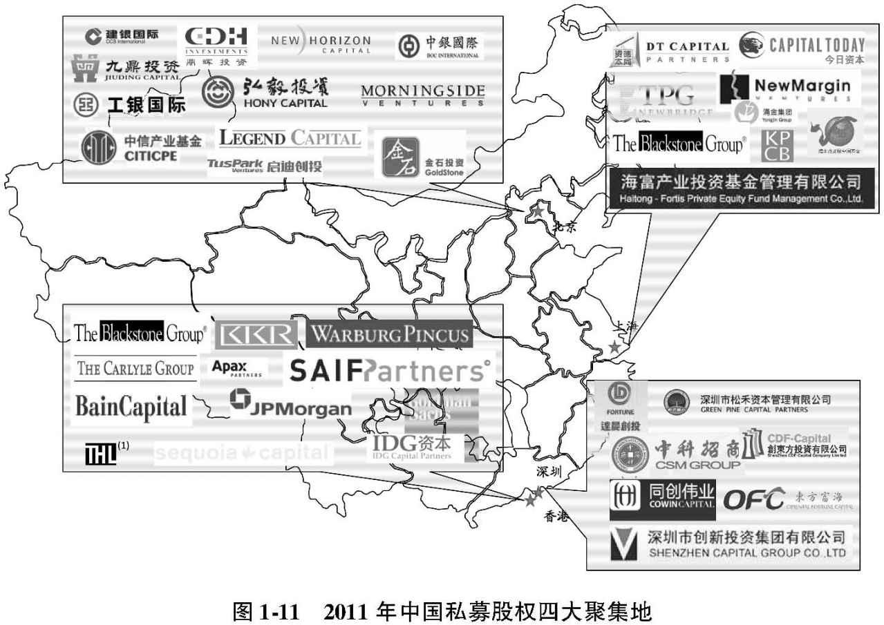 从地域分布来看,私募股权基金管理人大致集中在四个城市:北京、上海、深圳和香港(见图1-11)。香港是外资基金重要的桥头堡,从1990年代以来便一直是外资基金办公室的集中地。长期以来中国绝大部分私募股权投资案例都出现于北京、长三角和珠三角。此外,北京是中国金融监管机构和大型金融机构总部的所在地,上海和深圳则是主板、中小板和创业板市场的所在地。因此,它们集中了大多数私募股权基金管理公司是理所应当的。