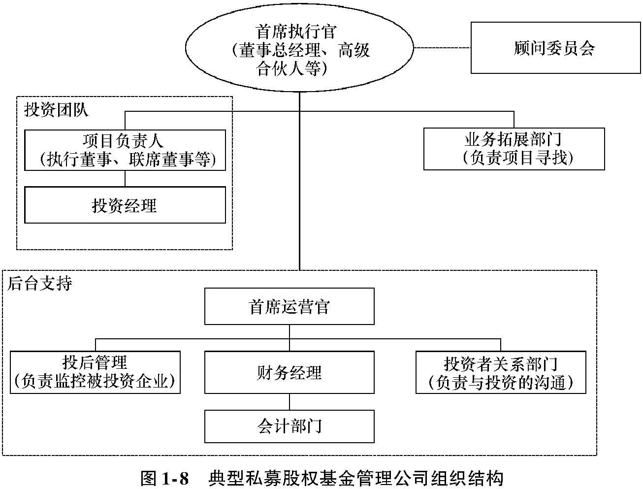 投资团队负责人的职位名称各异,可能是项目经理、执行董事、联席董事或投资董事。首席执行官或高级合伙人负责基金的总体管理,而投资项目的具体操作则是由投资团队来执行。在没有投后管理部门的情况下,投资团队要对其所投资的项目负责到底,直到完成整体退出。一般来说,投资团队的经理会作为被投资企业的外部董事在董事会中代表基金的利益,同时也为被投资企业的融资、战略、并购或上市提供专业建议。在基金管理层面,他们有可能也会参与投资委员会的决策。