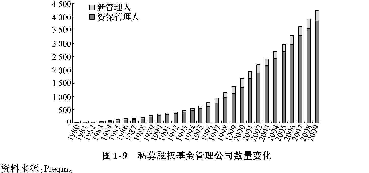 以上这些监管措施并没有对私募股权管理人的资质进行准入性限制,而只是要求基金管理人或基金向监管机构申报信息,仍属于备案制监管模式。与共同基金及对冲基金一样,新的基金管理人不断加入这一行业,同时也不断地有业绩糟糕的基金管理人退出市场。根据Preqin的统计,至2010年年底,全球市场上共有约4100家基金管理人,其中有450家左右是2010年新加入市场的。