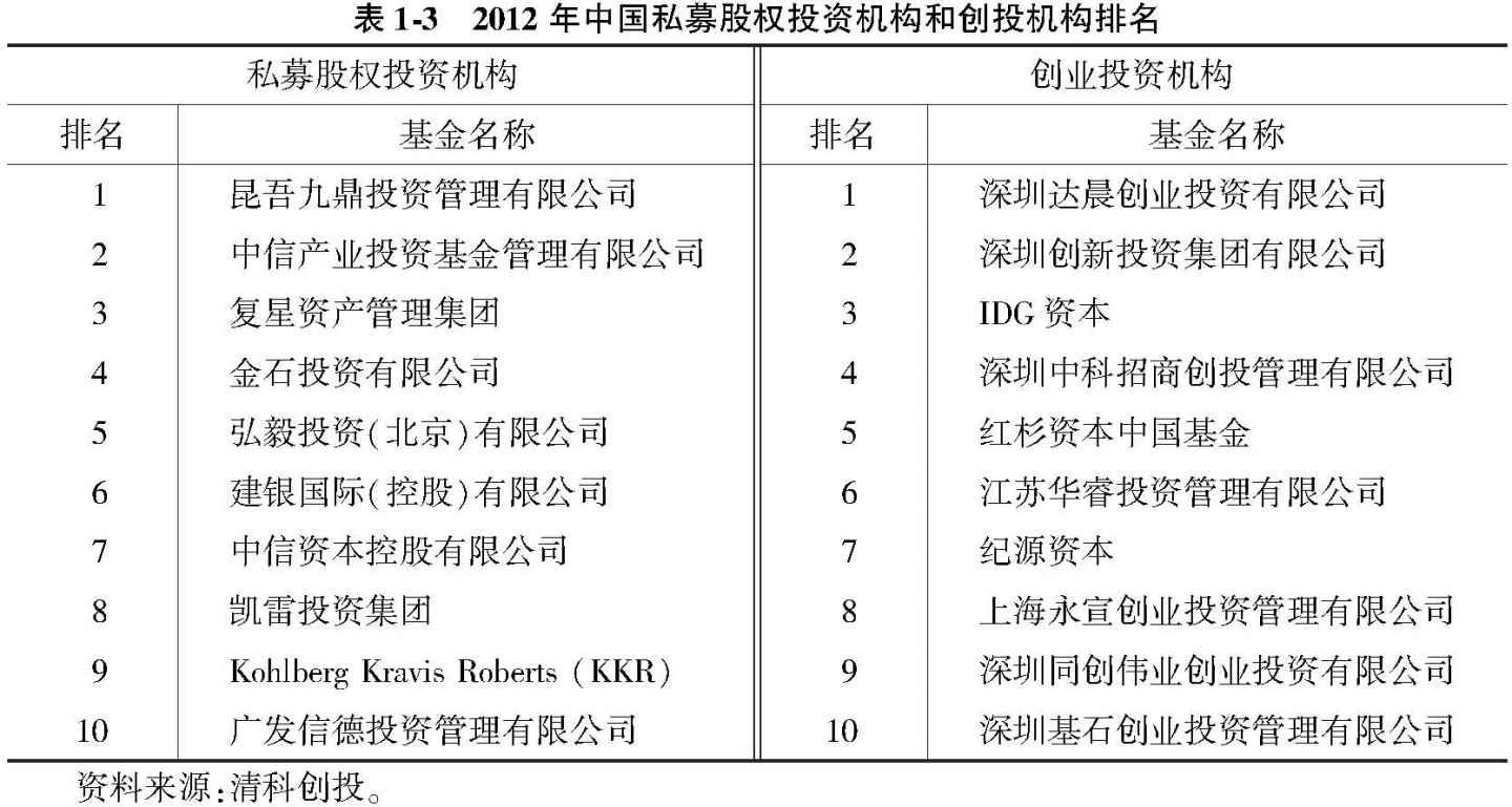 表1-3为清科创投发布的2012年中国私募股权投资机构和创投机构排名情况