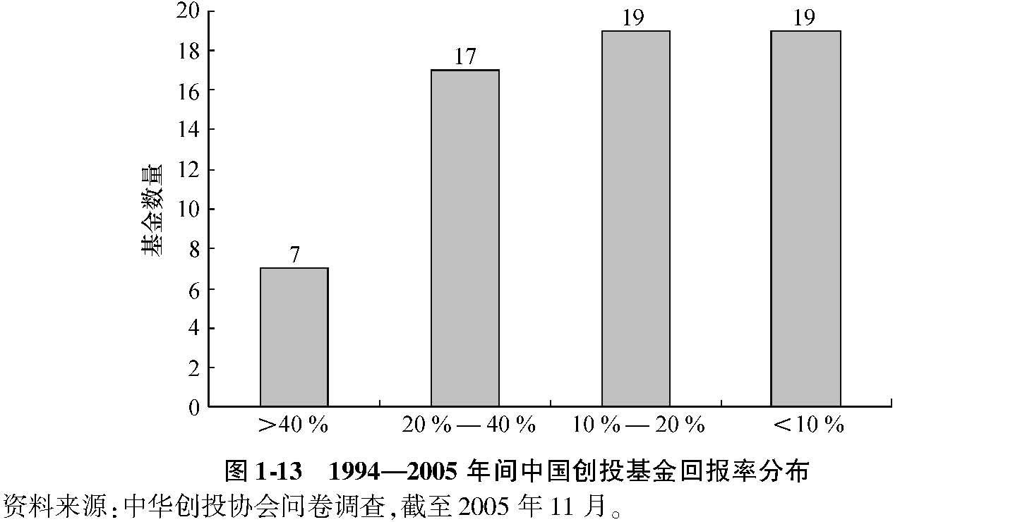 由于数据的缺乏,我国私募股权业的总体收益率并无准确的估计。中华创业投资协会(CVCA)对1994-2005年间在中国运营的62只美元及人民币创投基金进行了问卷调查。其中年平均回报率高于40%的有7只,介于20%到40%的有17只,介于10%到20%的有19只,低于10%的有19只(见图1-13)。在表现最差的19只基金中,有17只为人民币基金。从这些数据来看,我国私募股权业的平均回报率要略高于全球水平。