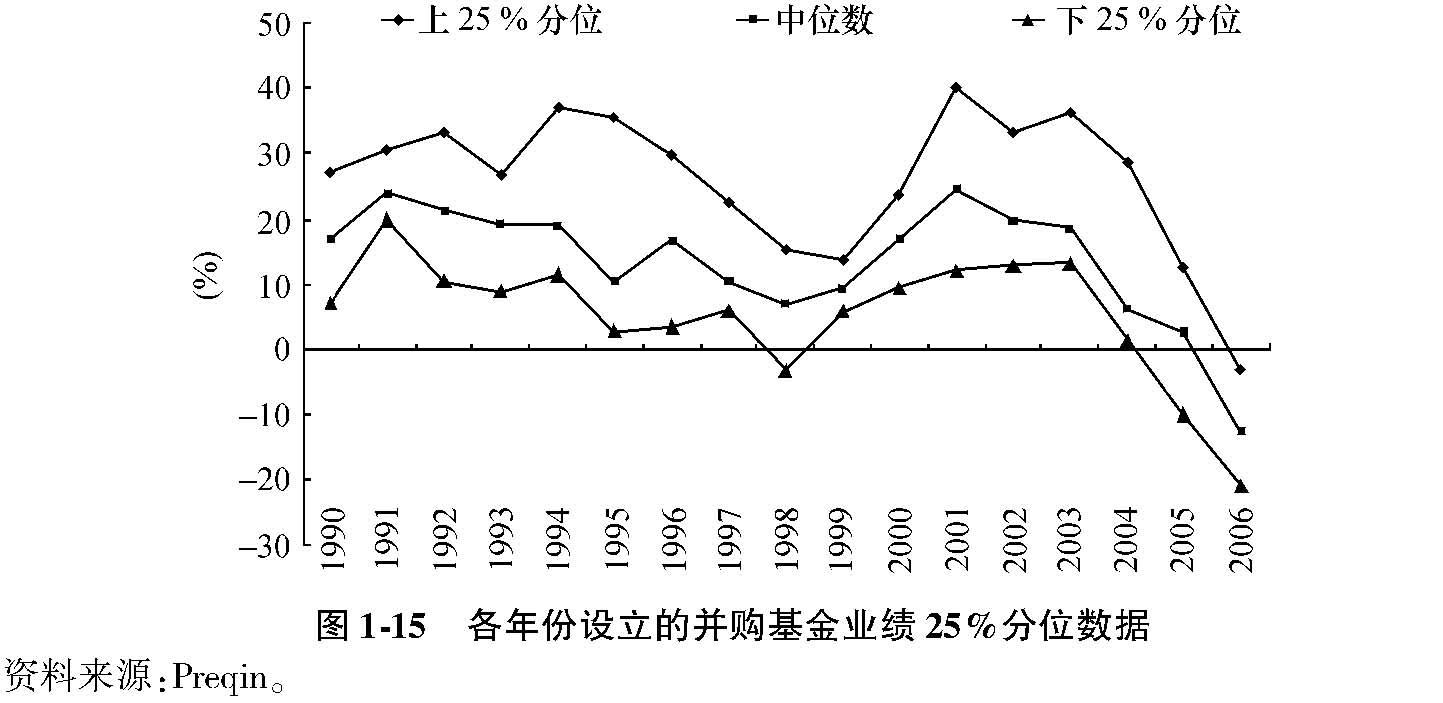 从图1-15中我们还可以看出,私募股权整体收益有明显的周期性。我们注意到,在牛市阶段设立的基金业绩普遍不佳,如1999-2000年网络泡沫时期和2005-2006年设立的基金。而熊市阶段设立的基金则业绩较好,如2001-2002年泡沫破裂后设立的基金。这部分是由于私募股权的商业模式,部分是由于股票市场的周期性。私募股权收购企业和出售企业的估值水平一般会参照同期上市公司的定价。当股票市场处于繁荣阶段时,私募股权套现的收益率会惊人地高。高收益率会吸引更多的投资者将资金注入私募股权。而在牛市阶段新设立的基金收购企业股权的定价水平又显著高于历史水平,当过了3-5年基金需要套现时,市场的定价已经回落,从而造成基金的低收益。与之相反,熊市阶段设立的基金所对应的估值变化循环则反而有利。