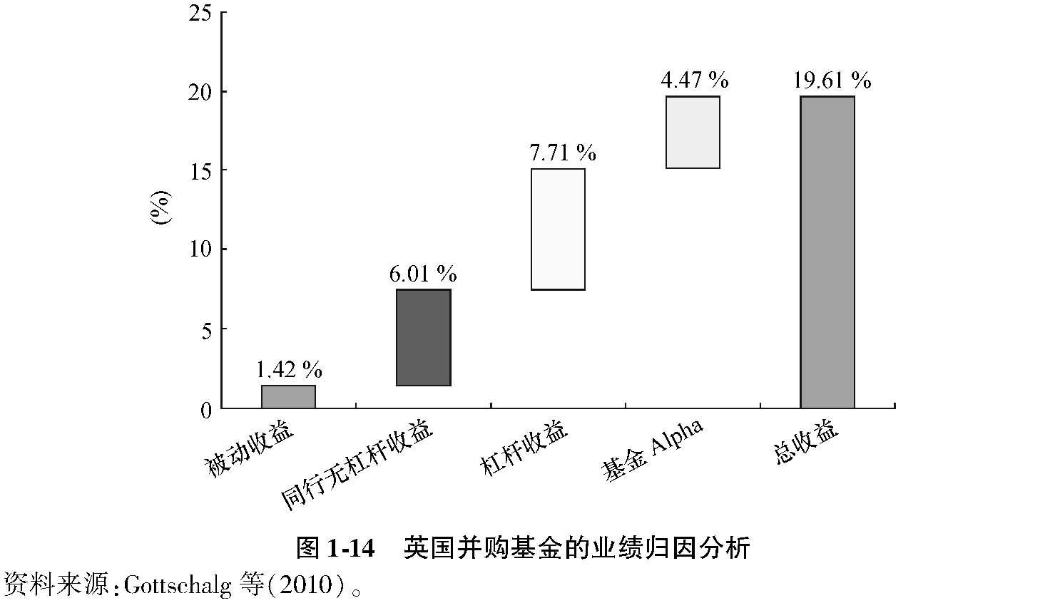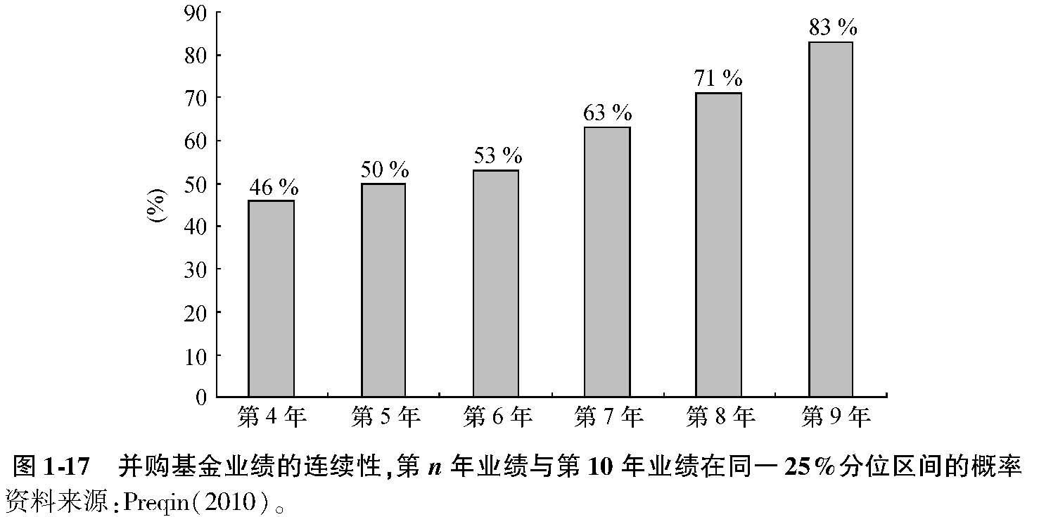 发现,在19.61%的基金净内部收益率中,杠杆率贡献了7.71%,而基金管理人才能的贡献部分仅为4.47%(见图1-14)。其他收益则来自正常的买入并持有策略收益(Buy and Hold Return),也即买入一家和私募股权投资案例相当的企业在同期所获得的股票收益率。