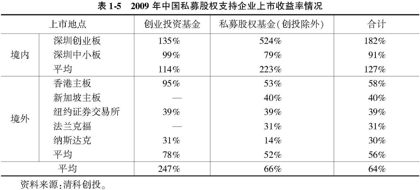 2009年以后随着创业板的推出,我国私募股权业的平均收益率显著超过了国际同行。表1-5为2009年中国私募股权基金投资案例按上市发行价格计算的平均收益率。需要注意的是,该表统计的是私募股权投资中最成功的一类,只有将那些失败的案例包括在内才能得出中国私募股权业的平均收益率。但遗憾的是,失败案例一般属于非公开信息。