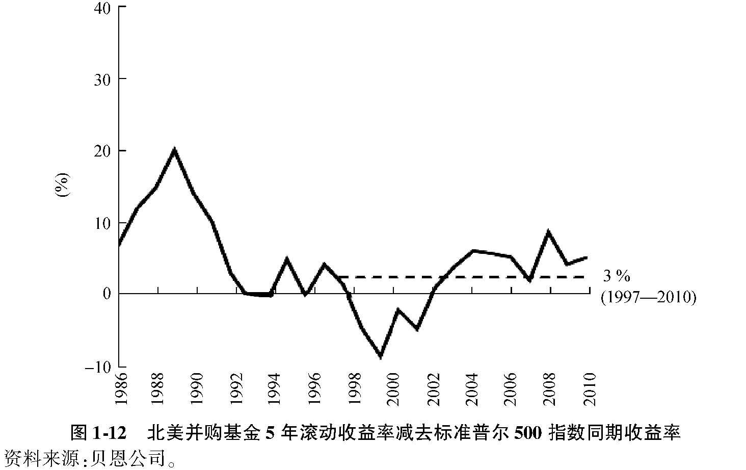 2007-2010年的次贷危机对全球经济造成了巨大的冲击,私募股权也不能幸免。如果将表1-4中的数据截止日期更改为2010年年底,情况可能会有很大不同。图1-12是全行业占比最高的美国并购基金5年滚动收益率相对同期标准普尔500指数收益的溢价走势。从图中我们可以看出,美国并购基金在1997-2010年间所获得的风险溢价还是3%左右。但需要注意的是,在此期间,作为基准指数的标准普尔500指数的年平均回报率只有区区2.14%。即便如此,作为一种另类投资,私募股权的长期收益率还是显著超过了股票和债券等主流投资。也正因如此,私募股权才得到了全球主要机构投资者的青睐。