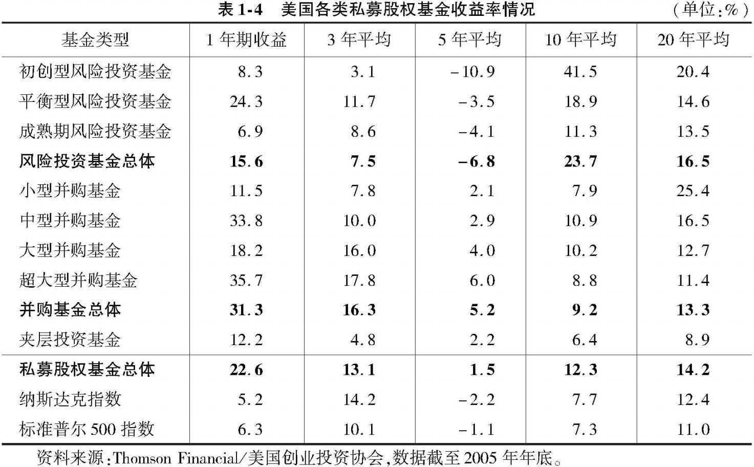 表1-4为截至2005年的美国各类型私募股权基金投资收益率汇总。我们可以发现,私募股权的20年平均收益率超过代表大盘股的标准普尔500指数3.2%,超过代表科技股的纳斯达克指数1.8%。如果初始投资额为1元,那么投资私募股权20年之后平均大约能得到14.2元,而投资纳斯达克指数只能得到10.3元,投资标准普尔500指数只能得到8.1元。这对于以长期收益为目标的机构投资者是巨大的差别。