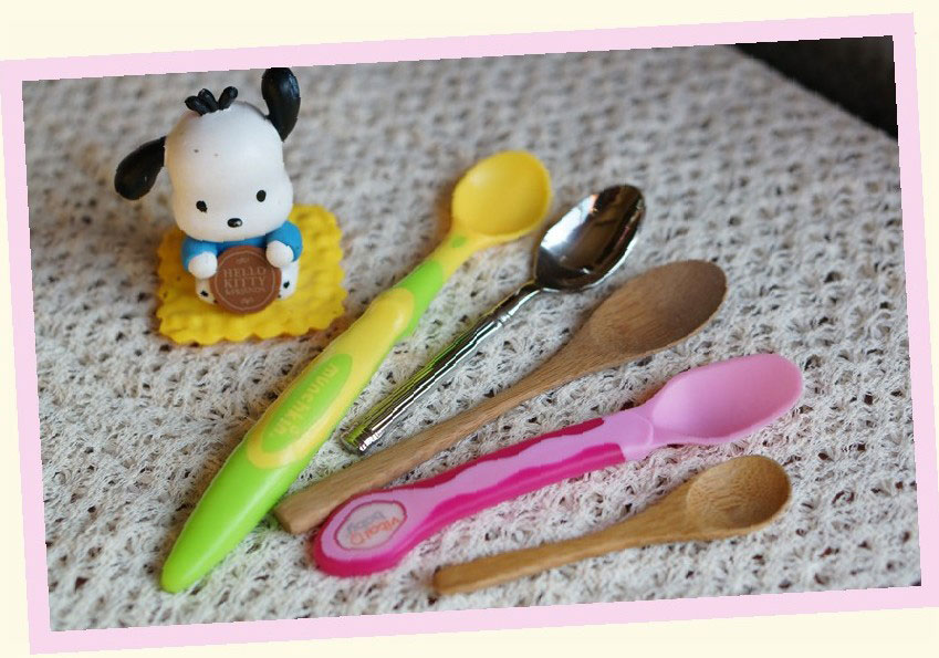 从左到右依次为塑料勺、不锈钢勺、木勺、硅胶勺、竹勺,刚开始吃辅食的宝宝可选用较软的硅胶勺,随着宝宝成长,可以更换其他材质的勺子。