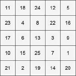 舒尔特方格是在一张方形卡片上画上1cm×1cm的25个方格(注意:方格必须是这个尺寸),格子内任意填写上1~25个阿拉伯数字。训练时,要求被测者用手指按1~25的顺序依次指出其位置,并大声读出。